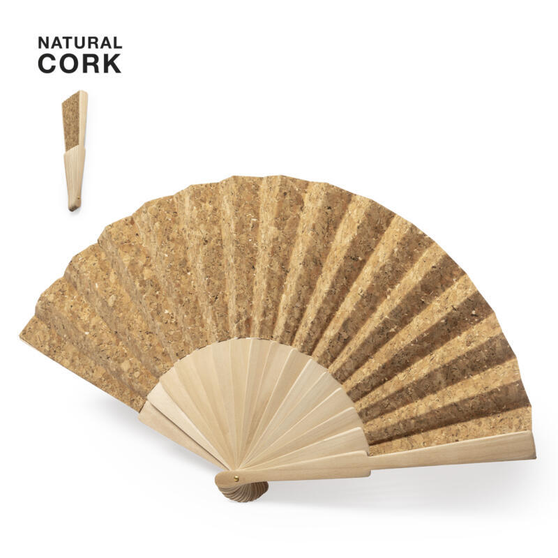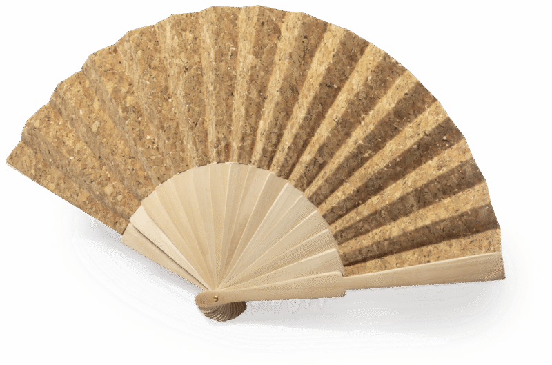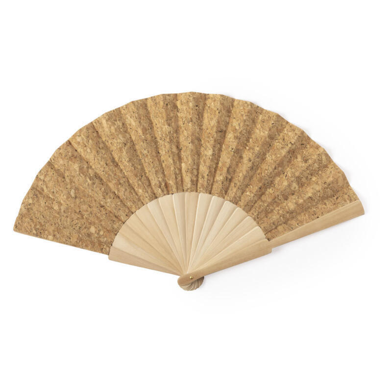Abanico de línea nature, con varillas de madera y tela en corcho natural. Presentado en caja individual de diseño eco.
