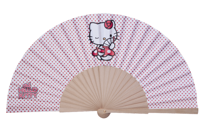 Abanico de Hello Kitty con varillas en madera natural y original diseño en tela con gatito de la marca. Presentado en caja individual.
