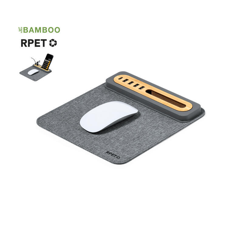 Elegante y funcional alfombrilla fabricada en combinación de suave poliéster RPET y bambú. Con puerto tipo C y cuatro puertos USB 2.0, permitiendo conectar y cargar los dispositivos fácilmente. Con soporte para smartphone y base antideslizante que garantiza un uso cómodo y estable. Introduce una nueva era de conectividad y sostenibilidad en el espacio de trabajo.Presentada en caja individual de diseño kraft y en bolsa reciclada.El material RPET se elabora a partir de plástico reciclado, para así fomentar la reutilización de residuos plásticos y ayudar a la sostenibilidad del planeta.