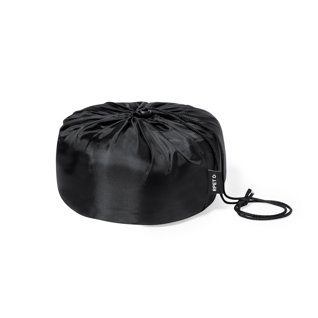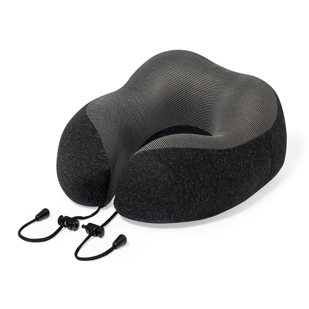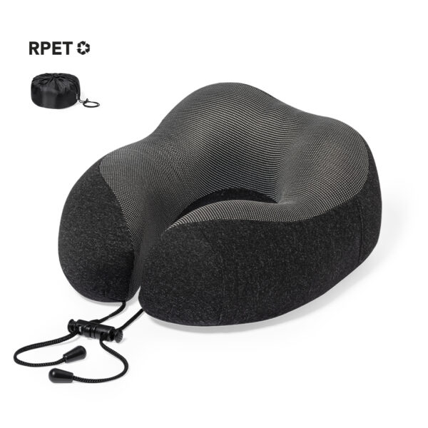 Cómoda almohadilla portátil acolchada para cuello. Máxima experiencia de confort para cualquier viaje gracias a la almohadilla de suave tacto y los cierres de cordón para un correcto y cómodo ajuste. Con funda confeccionada en RPET para protegerla en el transporte y etiqueta distintiva. El material RPET se elabora a partir de plástico reciclado, para así fomentar la reutilización de residuos plásticos y ayudar a la sostenibilidad del planeta.