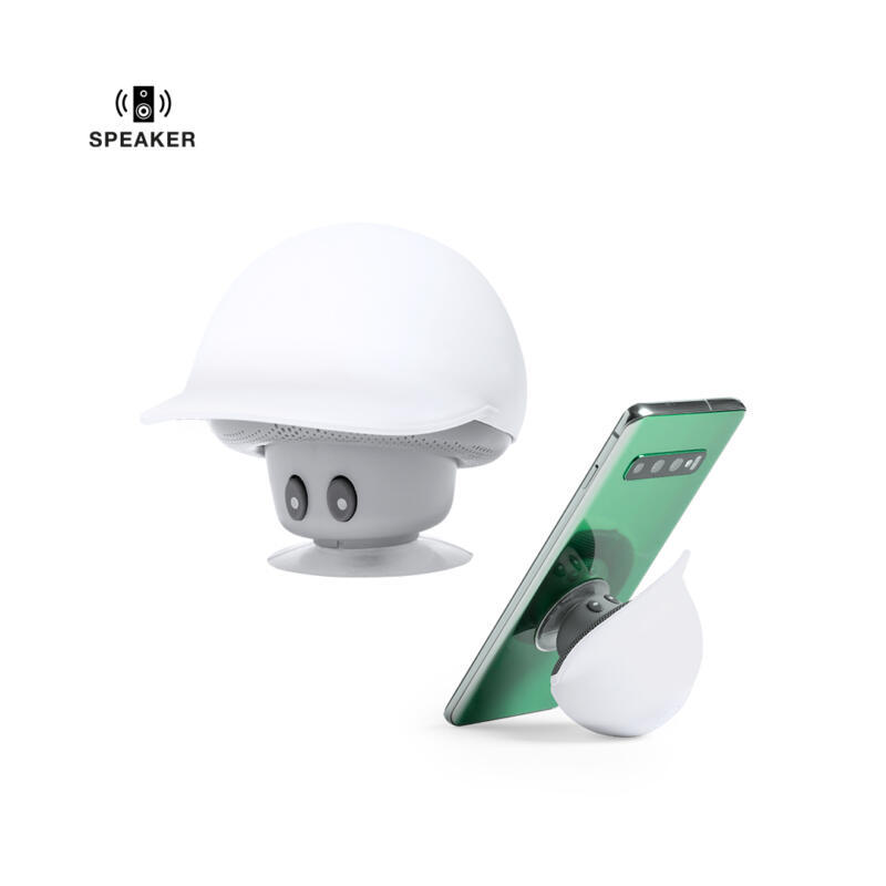 Altavoz de original diseño seta con gorra y función soporte para móvil. Conectividad Bluetooth 5.0, con 3W de potencia y función manos libres. Cuerpo con suave acabado de tacto goma y ventosa de fijación para función soporte. Cable Micro USB incluido y presentado en atractiva caja de diseño kraft. Disponible manual de instrucciones en español e inglés.