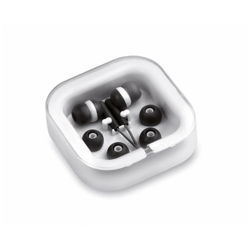 Prácticos y confortables auriculares intraurales de desenfadado diseño bicolor, conexión jack de 3,5mm y cable en color a juego. Disponible en variada gama de colores. Presentados en elegante estuche de diseño y con almohadillas de recambio.