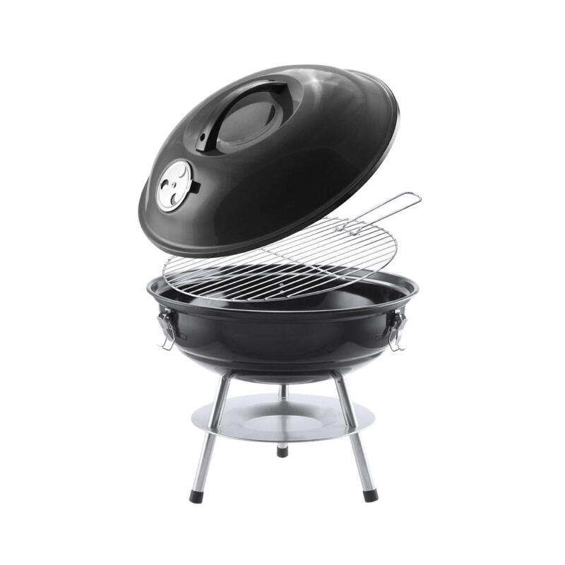 Barbacoa fabricada en resistente acero al carbono de acabado en negro. Tapa con cómoda asa y orificios de ventilación, con parrilla metálica, plato antigoteo y pies antideslizantes. Presentada en atractiva caja de diseño.
