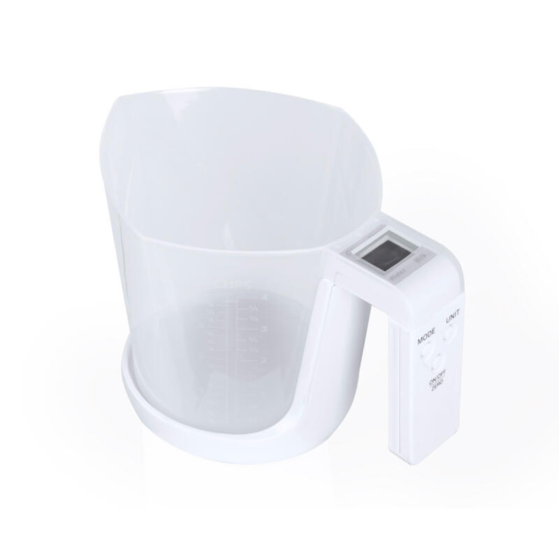 Báscula con jarra medidora integrada, fabricada en resistente combinación de PP y ABS. Pantalla LCD con control por botones y función de tara, con capacidad máxima para 5 kg de peso y válida para medir elementos líquidos o sólidos.Incluye Jarra medidora de 1L de capacidad, con multitud de opciones y vertedor para evitar derrames:-1L, con medidor lateral en tramos de 50 ml.-32 oz, con medidor lateral en tramos de 2 oz. -Medición rápida en volumen de tazas.Funciona con pila de botón (incluida) y viene presentada individualmente en caja.