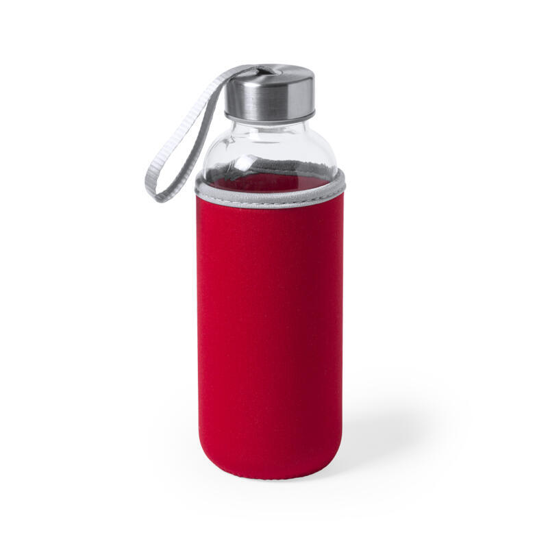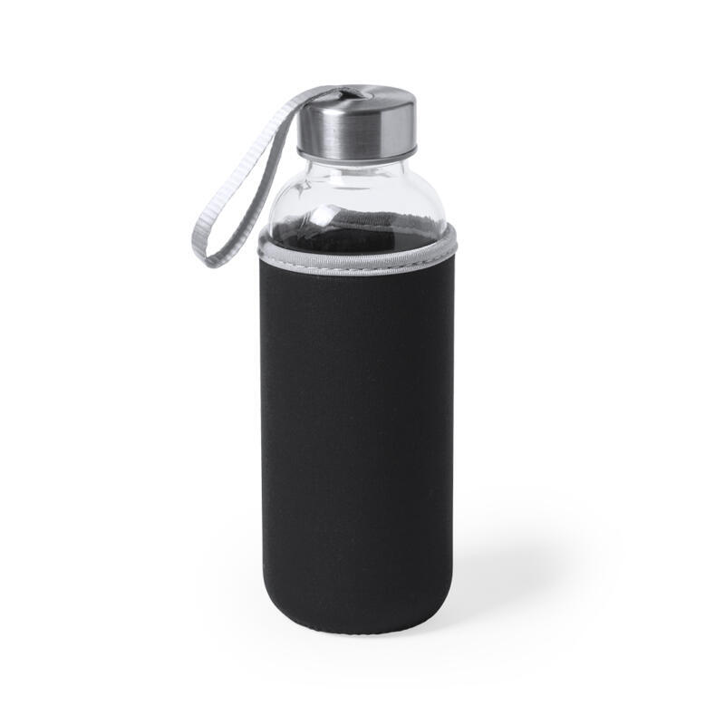 Bidón de cristal de 420 ml de capacidad. Con tapón de seguridad a rosca y practica cinta de transporte, cuenta con una elegante funda de neopreno en vivos colores. Presentado individualmente en una caja de diseño.