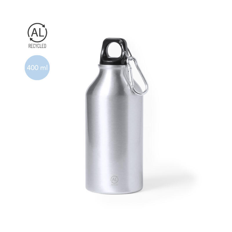 Bidón de 400 ml de capacidad. Fabricado en aluminio reciclado, con posibilidades de reciclaje casi infinitas, sin perder sus propiedades originales y consumiendo menos energía en este proceso. De acabado mate, con tapón a rosca en negro, anilla y mosquetón de transporte. Libre de BPA y presentado en caja individual de diseño kraft.Disponible manual de instrucciones en español e inglés.