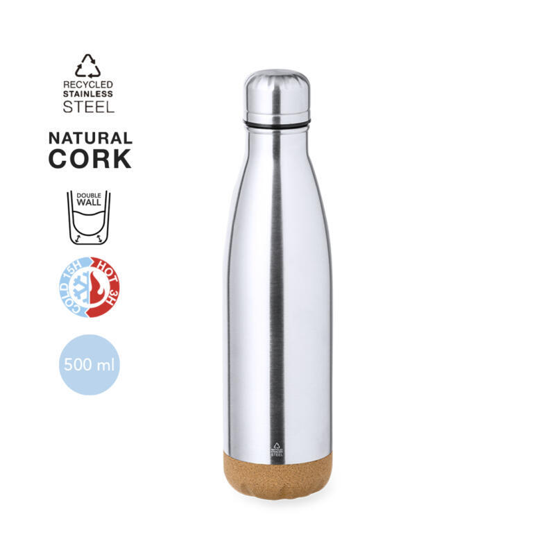 Bidón térmico de doble capa en Acero Inox Reciclado en 500 ml de capacidad. De acabado plata, con tapón a rosca a juego y base en corcho natural. Con logotipo Acero Inox Reciclado, libre de BPA y presentado en caja individual de diseño kraft.El acero es uno de los materiales más demandados y que puede encontrarse casi en todas partes, desde productos de uso diario a grandes construcciones. Con innumerables propiedades, entre las que cabe destacar la durabilidad y su alto grado de reutilización, convirtiéndolo en una alternativa muy valorada en soluciones de sostenibilidad. Debidamente tratado, permite obtener nuevos recursos de infinita utilización.