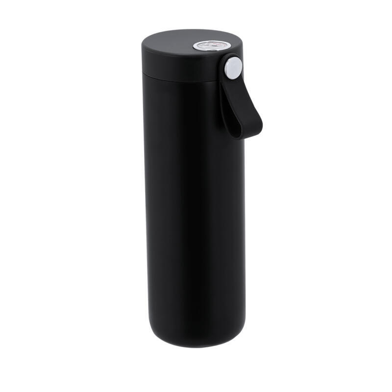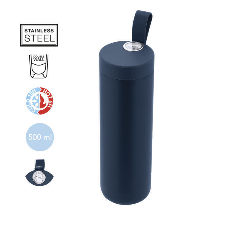 Bidón térmico de acero inox y doble pared de 500 ml de capacidad, con medidor de temperatura analógica, con rango de 0º a 100º. Con tapón de seguridad, asa de silicona integrada y cuerpo a juego. Libre de BPA.