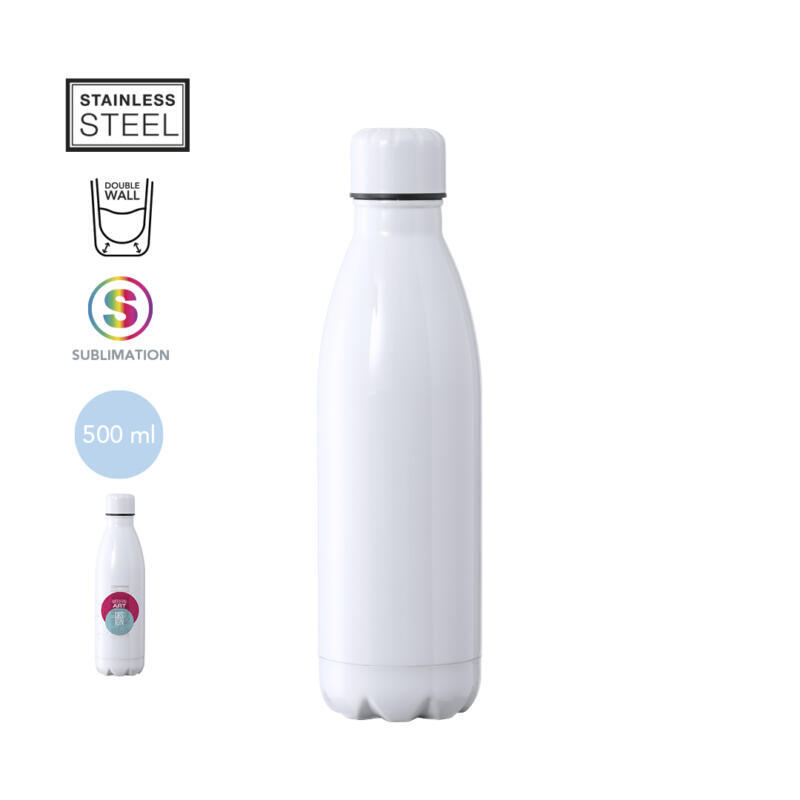 Bidón térmico de 500 ml de capacidad, fabricado en acero inox de doble pared y especialmente diseñado para marcaje en sublimación. De acabado blanco brillo y con tapón a rosca a juego, libre de BPA. Presentado en caja individual de diseño kraft.Disponible manual de instrucciones en español e inglés.