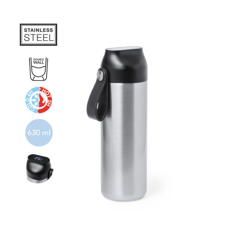 Bidón térmico de acero inox y doble pared de 630 ml de capacidad, con medidor de temperatura táctil en tapón y asa integrada. Con tapón de seguridad libre de BPA y presentado en atractiva caja individual de diseño Kraft y en bolsa reciclada. Alimentación a pilas (de botón incluida), con manual de instrucciones disponible en español e inglés.