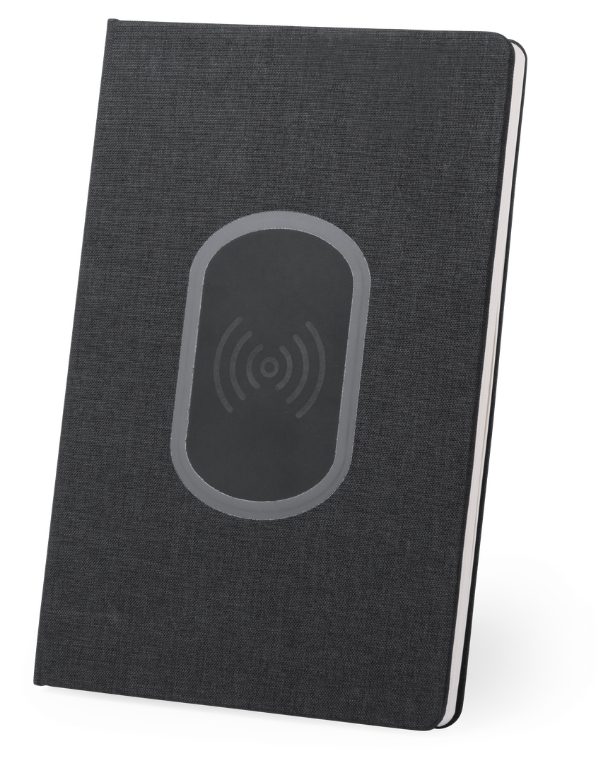 Bloc de notas cargador en resistente poliéster 300D con cargador inalámbrico integrado. De sobrio diseño y original estación de carga en la portada. Incluye 80 hojas con disposición a una raya.
