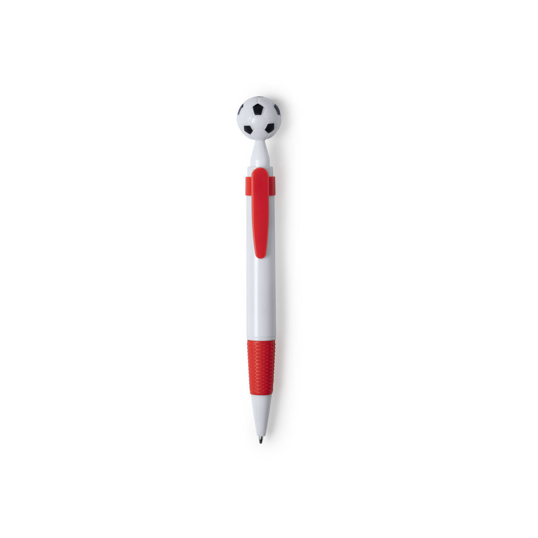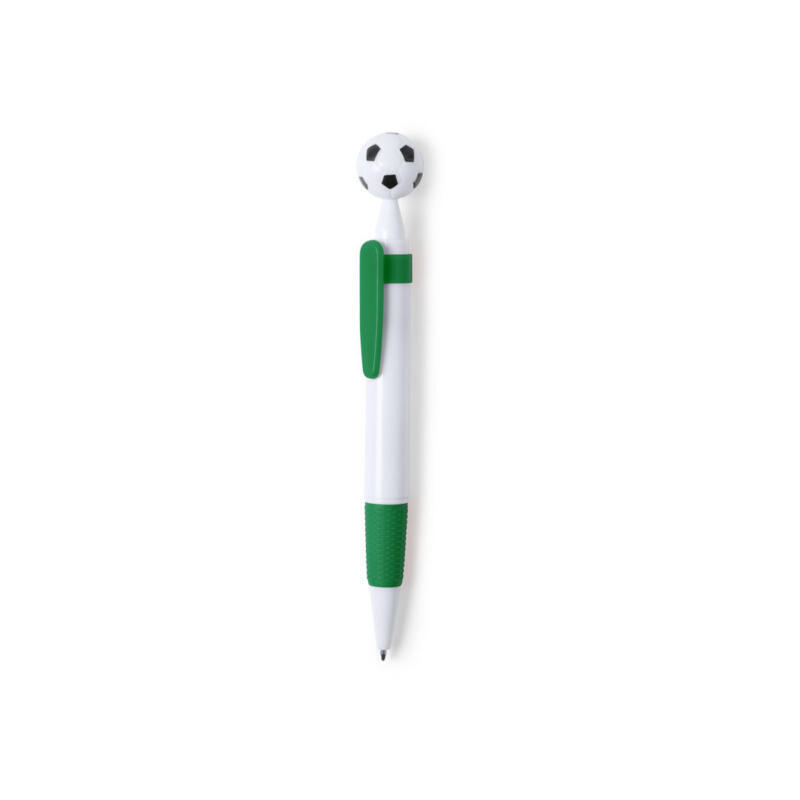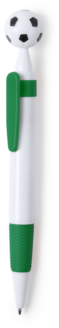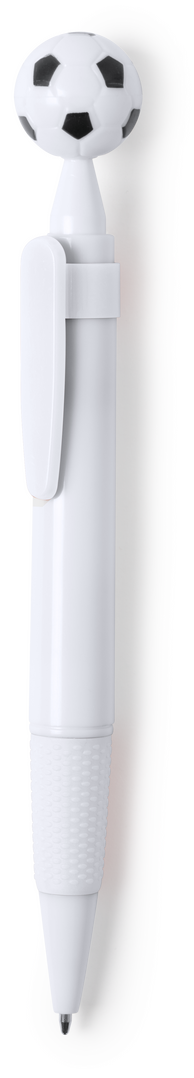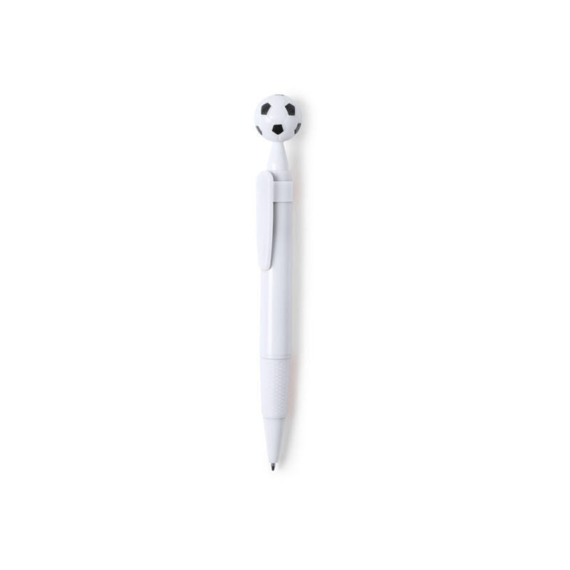 Bolígrafo para los más futboleros con detalle en forma de balón. De mecanismo pulsador y en desenfadado diseño bicolor. Con cuerpo en color blanco, con clip y empuñadura a juego, en variada gama de colores. Amplia superficie de impresión y en tinta azul.