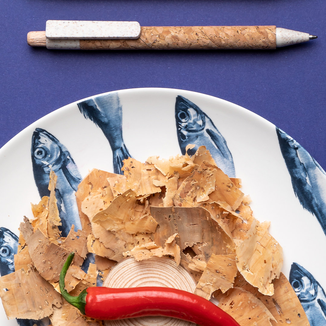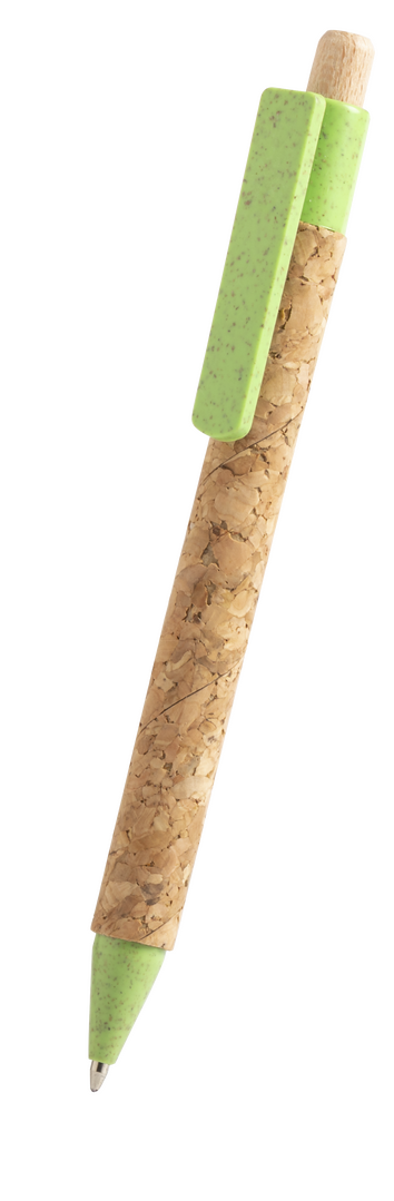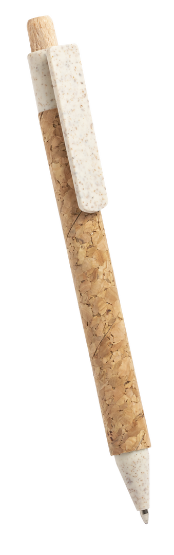 Bolígrafo de línea nature con cuerpo en corcho natural. Clip, punta y pulsador en caña de trigo, para así fomentar la utilización de materias primas naturales y reducir las emisiones de contaminantes. Con clip especialmente diseñado para marcaje en tampografía. De mecanismo pulsador y con tinta azul.