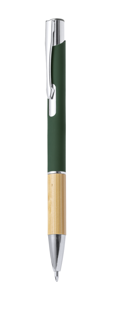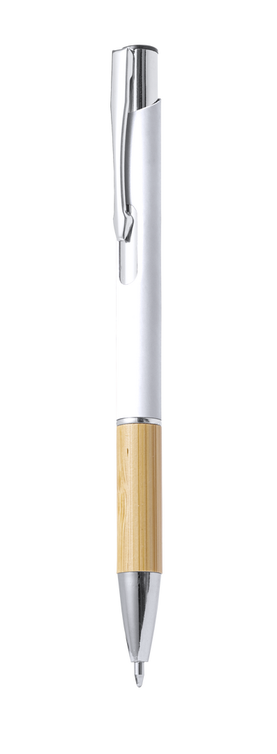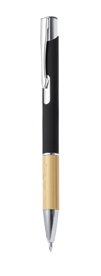 Elegante bolígrafo de línea nature y mecanismo pulsador. Cuerpo en resistente aluminio de acabado goma y empuñadura en bambú, con la caña en una amplia gama de distintivos colores. Clip metálico, con mecanismo pulsador y en tinta azul. Presentado en bolsa individual reciclada.