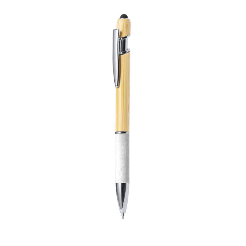 Bolígrafo puntero con cuerpo en bambú y papel reciclado. Caña fabricada en suave bambú con empuñadura hecha en cartón reciclado con textura y en variados colores. En la parte superior tiene un puntero negro. Clip metálico y accesorios en cromado. De mecanismo pulsador y en tinta azul.Elaborado con elementos vegetales para así fomentar la utilización de materias primas naturales y reducir las emisiones contaminantes.