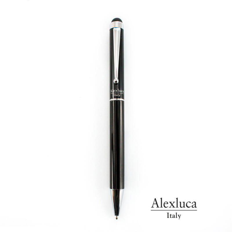 Bolígrafo puntero de Alexluca de mecanismo giratorio con suave cuerpo metálico de elegante color negro. Clip y punta de diseño a juego. Presentado en estuche individual negro con logotipo de la marca. Tinta azul.