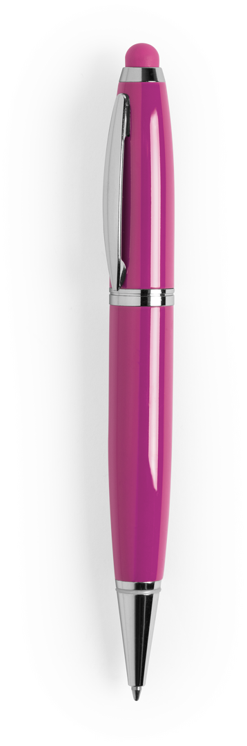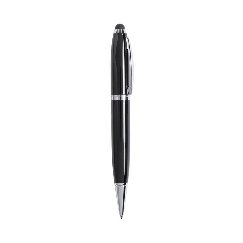 Bolígrafo tecnológico multifunción en sobrios colores, con memoria USB de 16GB de capacidad integrada en la capucha y puntero de suave goma a juego. Cuerpo en acabado métálico brillante, de apertura giratoria y con tinta azul. Presentado en elegante caja de cartón de color blanco con cierre magnético y suave espuma troquelada.