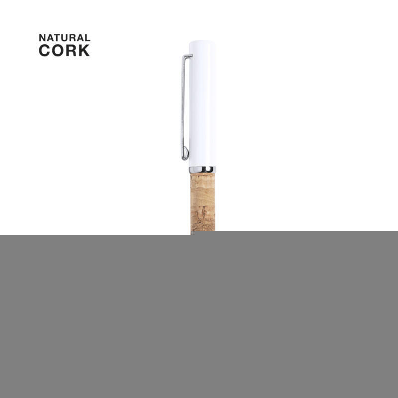 Bolígrafo de línea nature en combinación de corcho natural y metal. Con original clip metálico de acabado cromado, a juego con la punta y la anilla. Parte superior en color blanco, de mecanismo giratorio y con tinta azul. Presentado en caja individual de diseño eco.