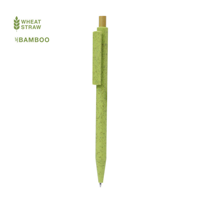 Bolígrafo fabricado con fibra de caña de trigo. Con cuerpo y clip a juego, de mecanismo pulsador fabricado en bambú y en tinta azul. Con distinguido logo de Caña de Trigo marcado en la caña. La Caña de Trigo fomenta la utilización de materias primas naturales, reduciendo así las emisiones contaminantes.