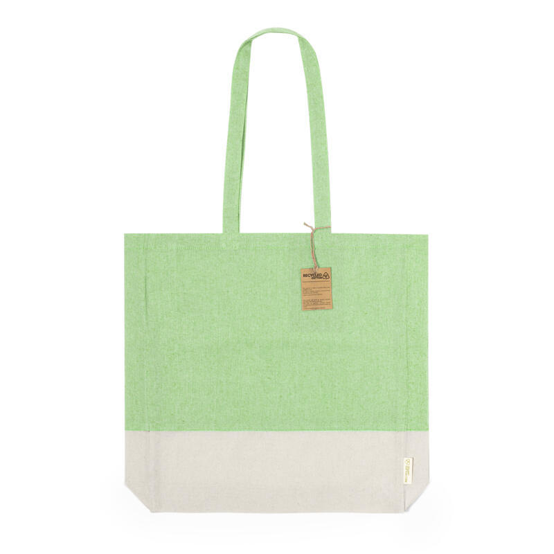 Bolsa en material 100% algodón reciclado de 120 g/m2. Asas largas de 70cm con refuerzo, de acabado cosido y fuelle. Logotipo en etiqueta lateral y resistencia hasta 8 kg de peso. Disponible en variada gama de colores nature con base de color natural.