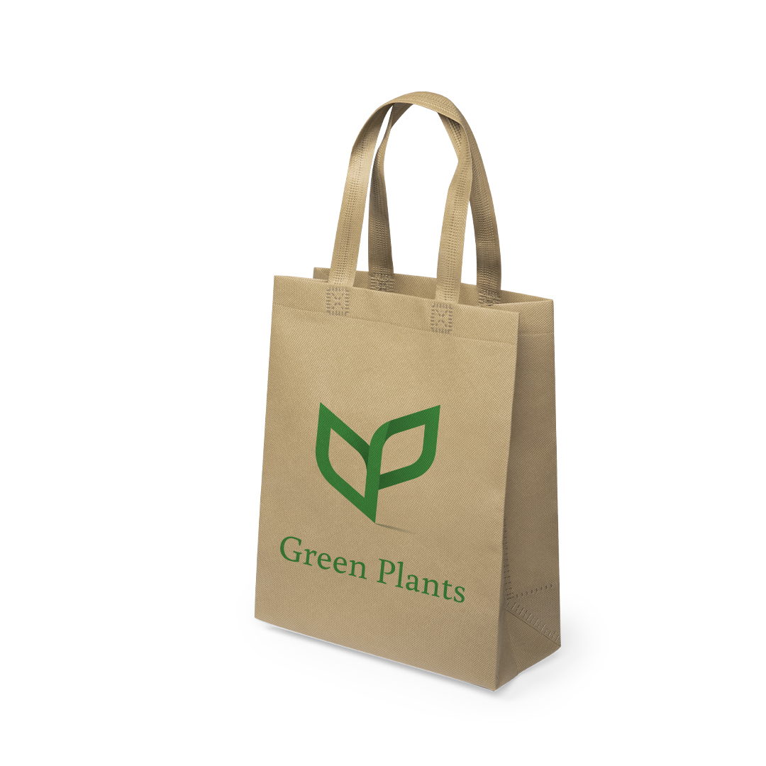 Bolsa reutilizable de inspiración nature en non-woven grueso de 90g/m2. Tamaño 25×31+11 cm, de acabado cosido y con asas cortas reforzadas de 27 cm. Resistencia de hasta 7 kg de peso.