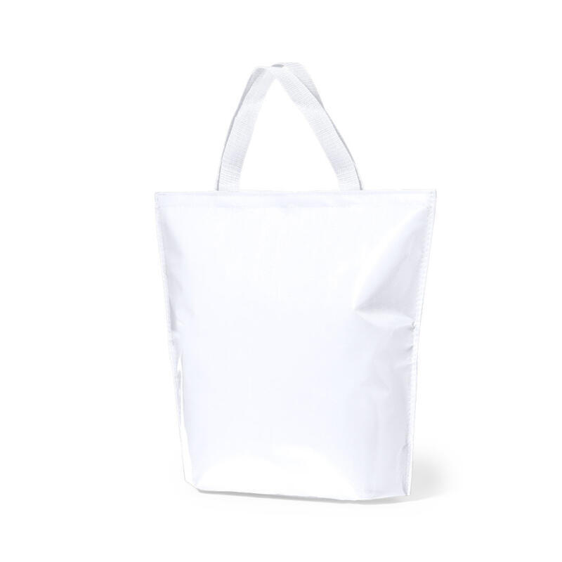 Bolsa nevera en resistente non-woven de acabado laminado brillante y cierre de velcro. Con cómodas asas de transporte en nylon a juego e interior isotermo en acabado de aluminio. Resistencia hasta 7kg de peso.