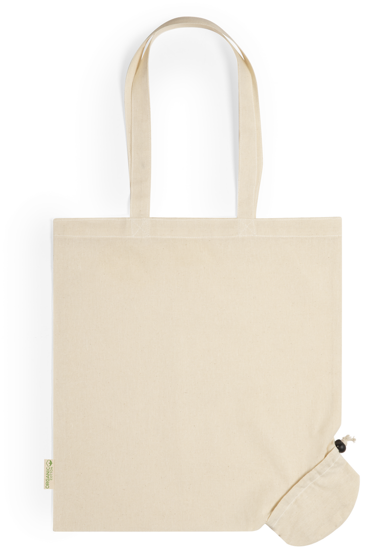 Bolsa plegable de línea nature en material 100% algodón orgánico natural de 120 g/m2. Asas largas de 70cm con refuerzo y de acabado cosido. Distintivo organic en etiqueta lateral y resistencia hasta 9 kg de peso. Plegado de pequeño tamaño para fácil transporte.
