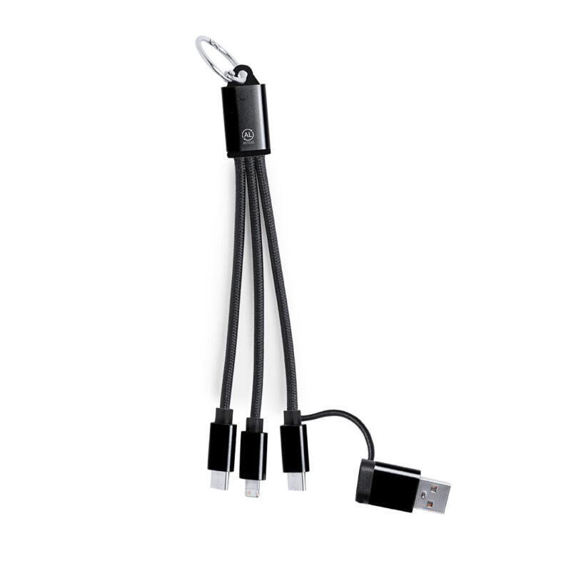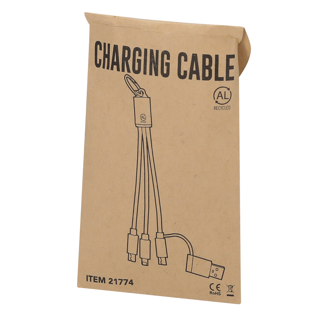 Cable cargador en Aluminio Reciclado. Con conexión de entrada dual Tipo C/USB y salidas Tipo C, Lightning y Micro USB. Incluye distintivo Aluminio Reciclado.El Aluminio Reciclado es un material con posibilidades de reciclaje casi infinitas, sin perder sus propiedades originales y consumiendo menos energía en este proceso.Certificación GRS (Global Recycled Standard / Estándar de Reciclaje Global), que garantiza el origen reciclado del material usado para fabricar el producto.Conexión Micro USB, Tipo C y Lightning 5V DC 2.4A