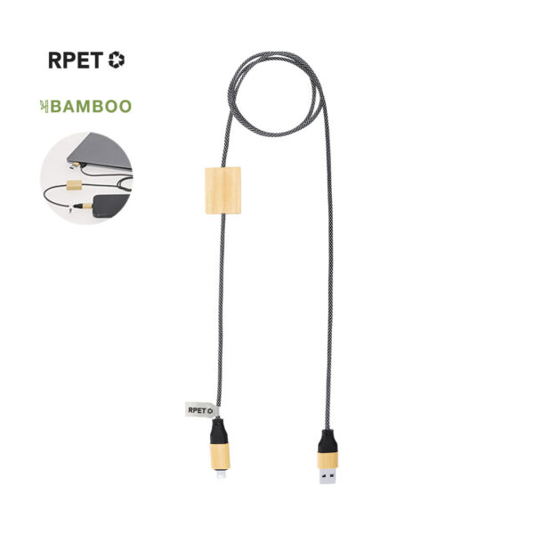 Cable cargador de 60 W en una combinación de RPET y bambú. Con conexiones de entrada Tipo C y USB y conexiones de salida Lightning, Micro USB y Tipo C. Potencia de carga: Hasta 60W, asegurando una carga rápida y eficiente.
