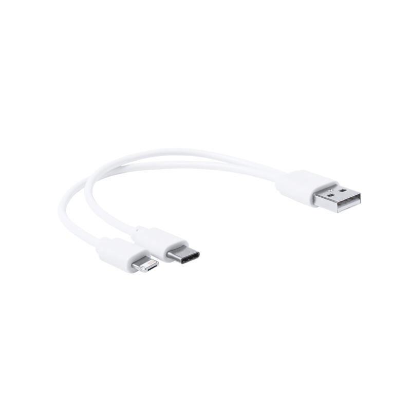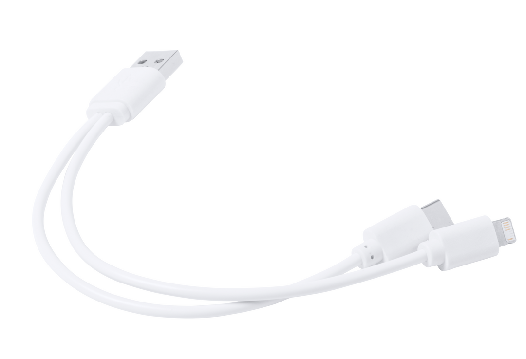 COMPRAR CON IMPRESIÓNCable cargador USB con conexiones Tipo-C y dual micro USB/Lightning. En diseñó minimalista de color blanco.