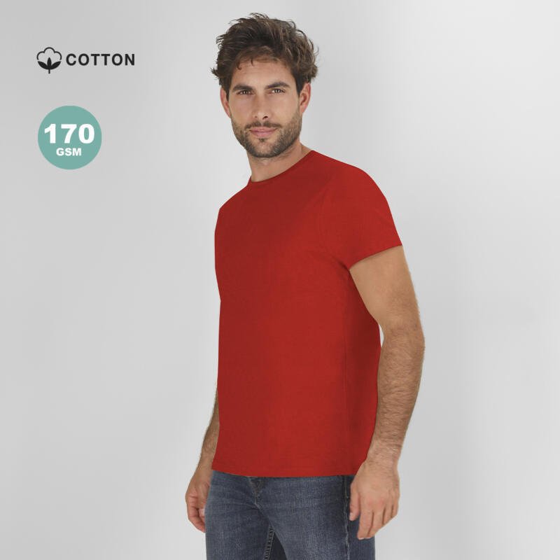 Camiseta de manga corta unisex confeccionada en algodón de punto liso de 170 g/m2. Con cuello redondo de 4 capas en canalé 1×1. Cuenta con costuras laterales y cubre costuras de hombro a hombro.