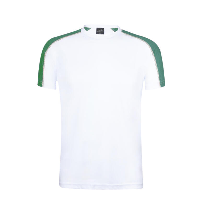 Camiseta técnica para adulto en material dynamic, altamente transpirable y confeccionada en tela 100% poliéster de 135g/m2. Original diseño en color blanco, con franja de color en las mangas. Disponible en variados colores y en tallas S, M, L, XL, XXL.