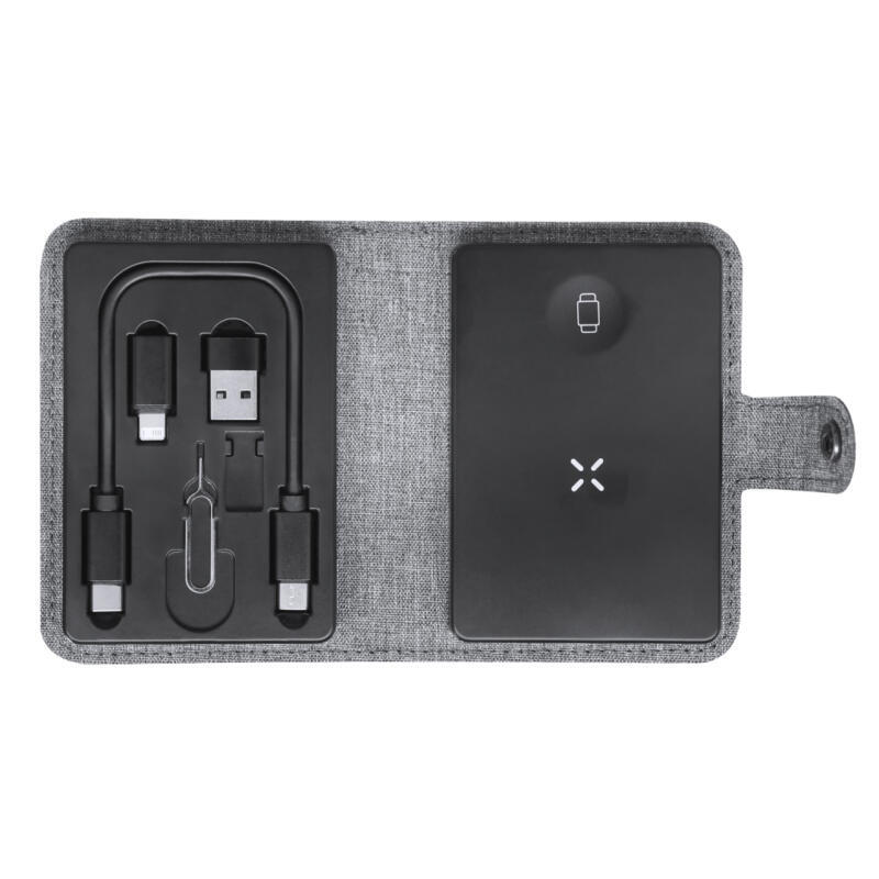 Completa base cargadora fabricada en 300D RPET. Estuche con cierre de corchete incluyendo base cargadora inalámbrica Qi para smartphone, auriculares y smartwatch. Contiene cable de conexión Tipo C en ambos extremos, además de adaptadores USB y lightning/micro USB. El set lo completa un eyector de tarjeta SIM y un compartimento para guardar una tarjeta Micro SIM. Con distintivo RPET.El material RPET se elabora a partir de plástico reciclado, para así fomentar la reutilización de residuos plásticos y ayudar a la sostenibilidad del planeta.