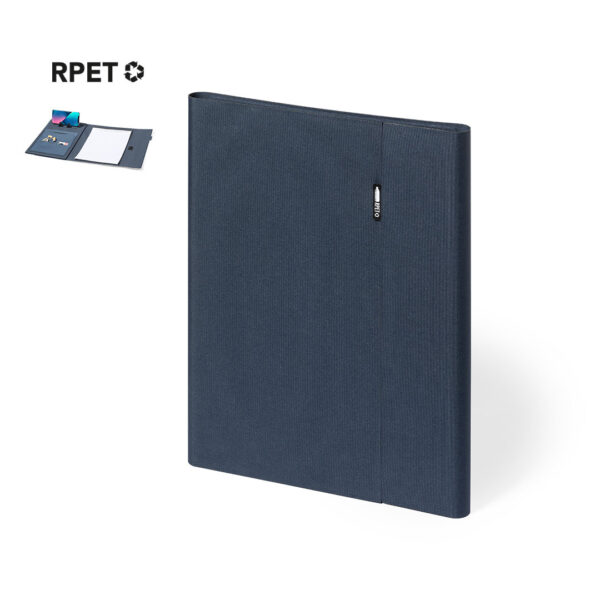 Carpeta fabricada en poliéster 600D RPET, elaborado a partir de plástico reciclado, para así fomentar la reutilización de residuos plásticos y ayudar a la sostenibilidad del planeta. Con cierre magnético y distintivo RPET. Interior con soporte para smartphone y multitud de compartimentos para tarjetas, incluidos soporte para bolígrafo y bloc con 20 hojas de disposición a una raya. Presentada en atractiva caja individual de diseño y disponible en variada gama de colores.