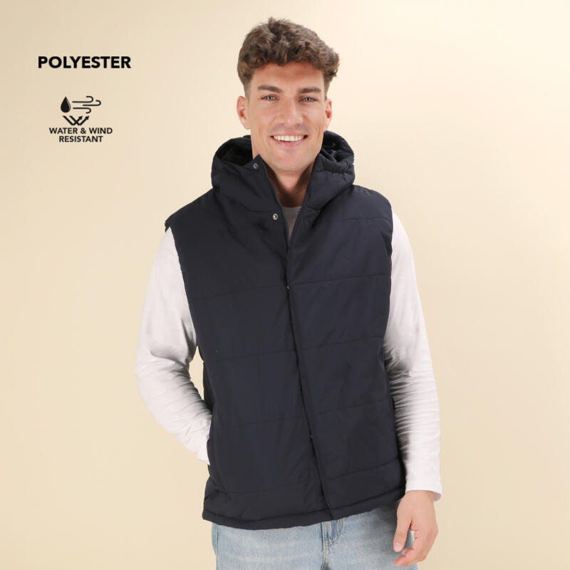 Chaleco con capucha, en cálido y suave material 100% poliéster. En material ligero, resistente al viento y al agua. Diseño de elegante construcción horizontal y acolchado, con capucha fija integrada. Doble cierre frontal de cremallera y corchetes. Bolsillos laterales con tiradores a juego y cordón ajustable en dobladillo. Disponible en tallas XS, S, M, L, XL, XXL.