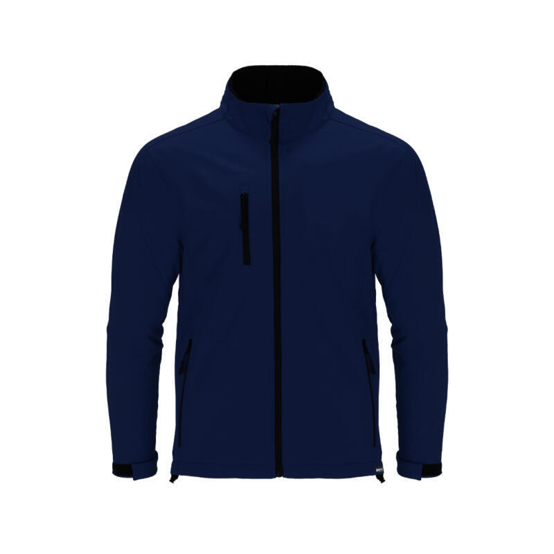 Chaqueta Soft Shell RPET confeccionada en 3 capas, de 340 g/m2. Con membrana de 8000mm, impermeable y transpirable. Exterior en Soft Shell e interior en tejido polar microfleece en color negro. Con bolsillo exterior en pecho derecho y dos bolsillos laterales con cremalleras. Con cremallera central y cremalleras invertidas en bolsillos, incluyendo tiradores de cordón en color negro. Mangas ranglán con sistema de ajuste de velcro en el puño en color negro. Cuenta con protector de barbilla a juego y cintura ajustable, con cordón elástico y tope. Distintivo RPET en el ribete de la prenda.