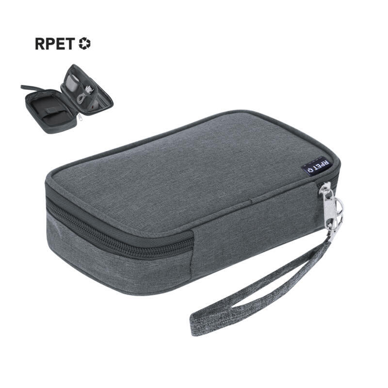 Estuche organizador fabricado en RPET 600D. Incluye bolsillo principal de apertura completa con tirador metálico y múltiples bolsillos interiores ideales para guardar cables: 2 bolsillos con banda elástica, 1 con cierre de cremallera y compartimento con banda elástica con velcro. Incluye cinta para un cómodo transporte. Con distintivo RPET.El material RPET se elabora a partir de plástico reciclado, para así fomentar la reutilización de residuos plásticos y ayudar a la sostenibilidad del planeta.