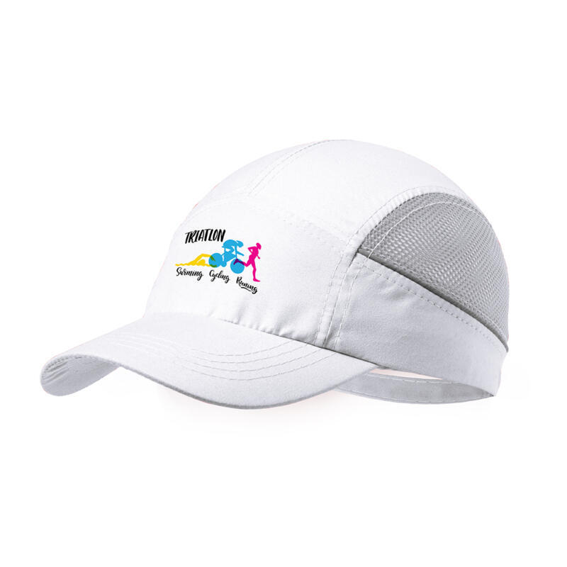 Gorra deportiva fabricada en suave y resistente microfibra. Con redecilla a juego para el sudor en paneles laterales y cierre ajustable de velcro. Con bandas reflectantes en los laterales y disponible en variada gama de colores -color blanco especial para marcaje en sublimación-.