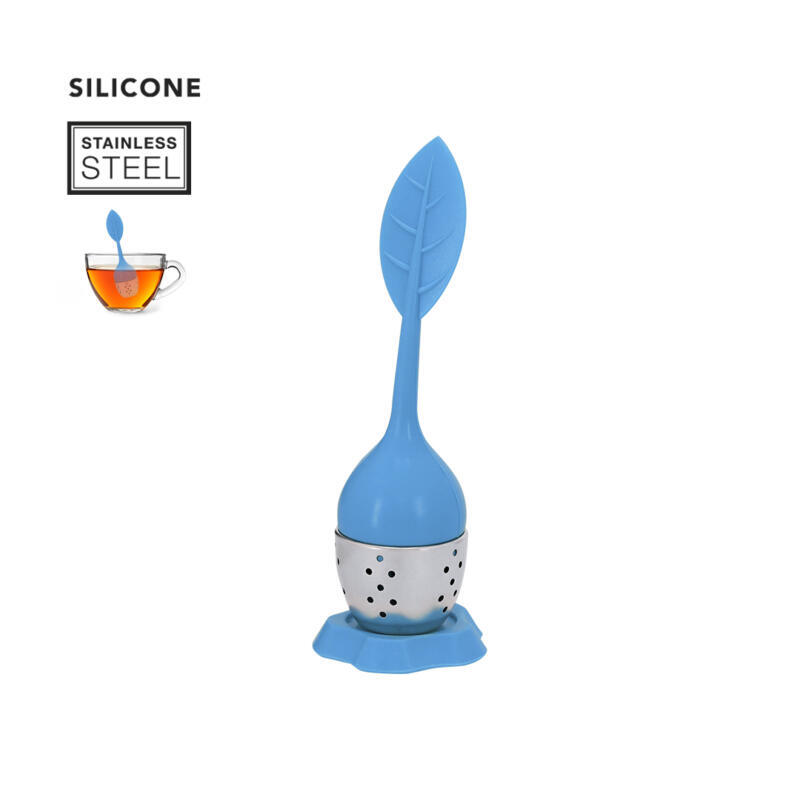 Infusor de té con diseño hoja, fabricado en silicona y acero inoxidable. Incluye base de silicona.