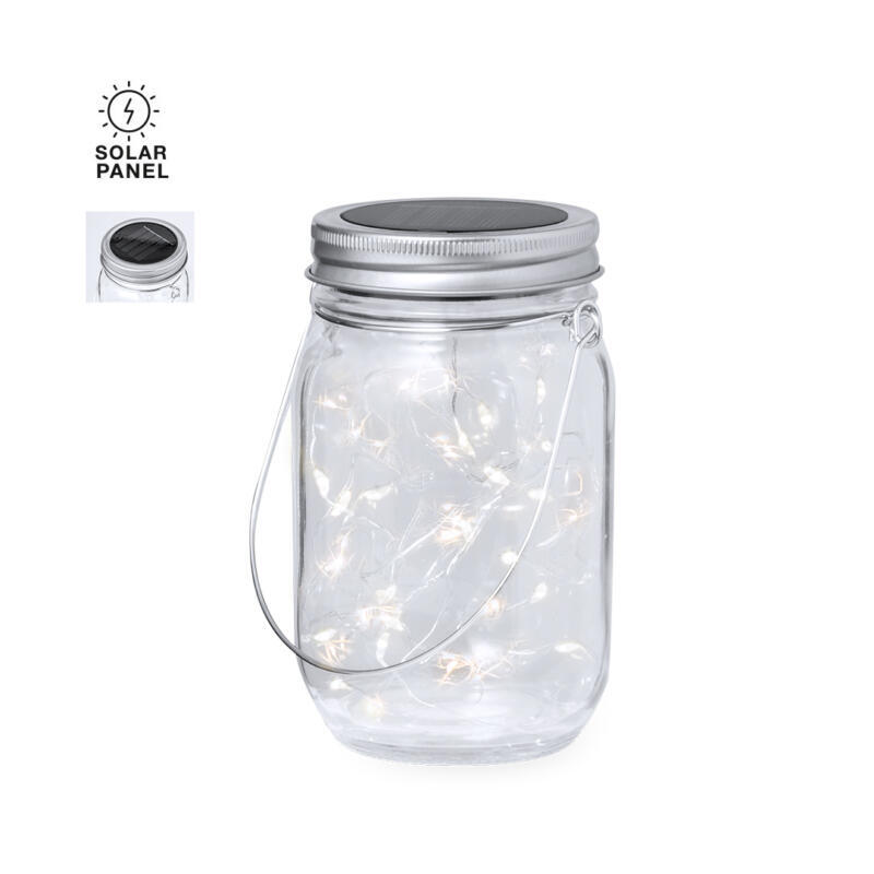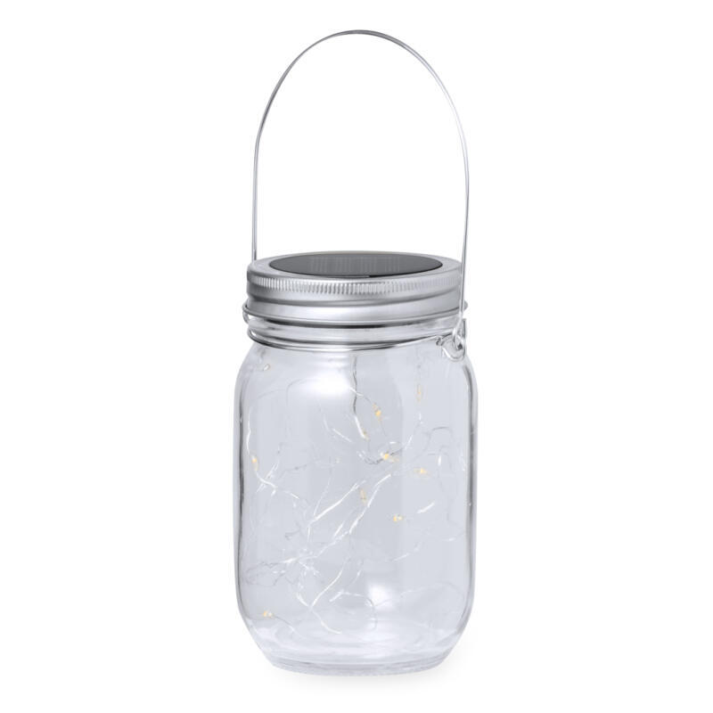Original lámpara tarro solar, fabricada en resistente material cristal y con una tira interior decorativa de 20 LEDs. Incluye tapadera a rosca metálica con minipanel solar de recarga integrado y una batería recargable de 300 mAh. Con práctica asa para transportar o colgar, y presentada en caja individual de diseño kraft.