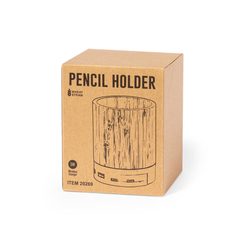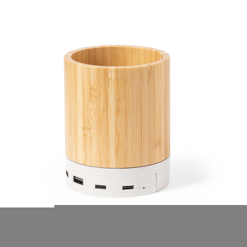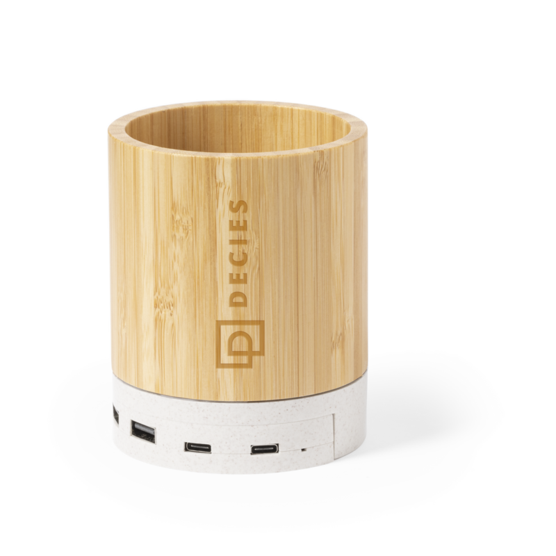 Lapicero multifunción 4 en 1 fabricado en bambú y fibra de trigo.Con funciones lapicero, soporte para smartphones, cargador inalámbrico 5W, puerto USB (2xUSB 2.0 y 1x tipo C) . Compatible con smartphones con tecnología de carga inalámbrica Qi. Incluye cable tipo C en color blanco de 1 metro de largo. Presentado en atractiva caja de diseño kraft. Disponible manual de instrucciones en español e inglés.Elaborado con elementos vegetales para así fomentar la utilización de materias primas naturales y reducir las emisiones contaminantes.