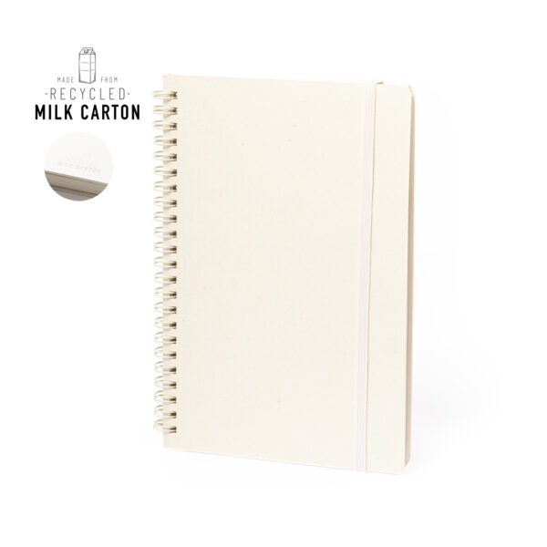 Libreta de anillas doble metálicas A5 con tapas duras fabricado a partir de cartones de leche reciclados. Interior con 80 hojas color natural a una raya microperforadas y elástico de cierre en color natural. Logotipo Recycled Milk Carton en contra portada y presentada en bolsa individual reciclada.Los cartones de leche se componen en su mayor parte de cartón y aluminio. Durante su proceso de reciclado, se separan los distintos materiales del envase para su reutilización y nuevo uso, contribuyendo así a recorrer el camino infinito de la economía circular. Este material se caracteriza por su alto grado de reciclabilidad, así como por su ligereza y resistencia.