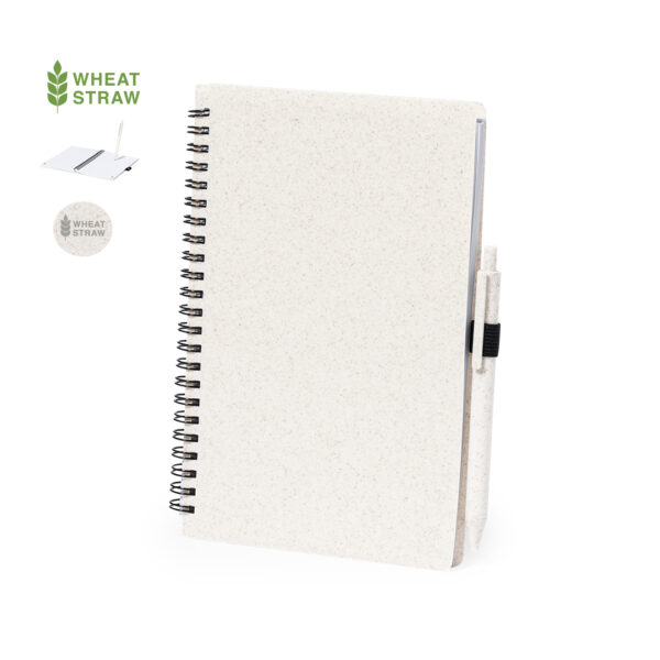 Set de libreta y bolígrafo. Libreta de anillas con tapas en caña de trigo y soporte para el bolígrafo. De 80 hojas con diseño eco y disposición a una raya. Bolígrafo de mecanismo pulsador, con cuerpo en caña de trigo y tinta azul. Con distintivo Wheat Straw. Presentado en bolsa individual reciclada.Elaborado con elementos vegetales para así fomentar la utilización de materias primas naturales y reducir las emisiones contaminantes.