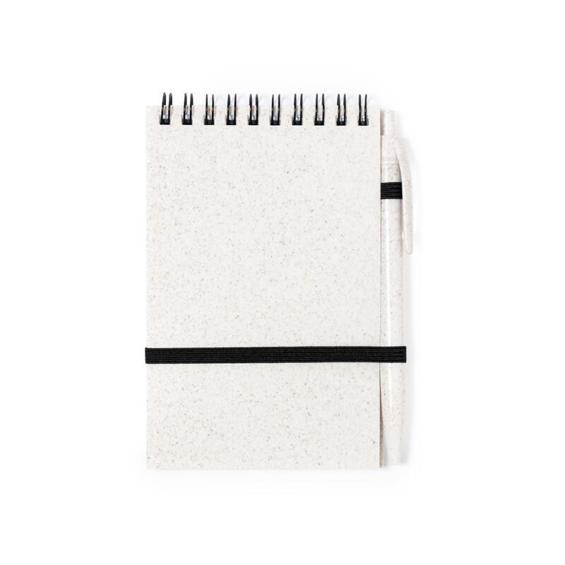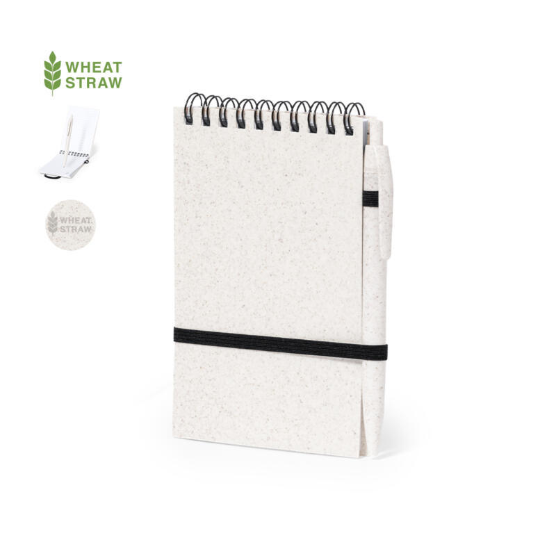 Libreta de anillas con tapas de caña de trigo y bolígrafo a juego, también en caña de trigo. De tamaño compacto, con elástico de cierre en elegante color negro. Incluye 70 hojas con disposición a una raya y diseño eco. Bolígrafo de mecanismo pulsador en caña de trigo con tinta azul. Incluye distintivo Wheat Straw. Presentado en bolsa individual reciclada.Elaborado con elementos vegetales para así fomentar la utilización de materias primas naturales y reducir las emisiones contaminantes.