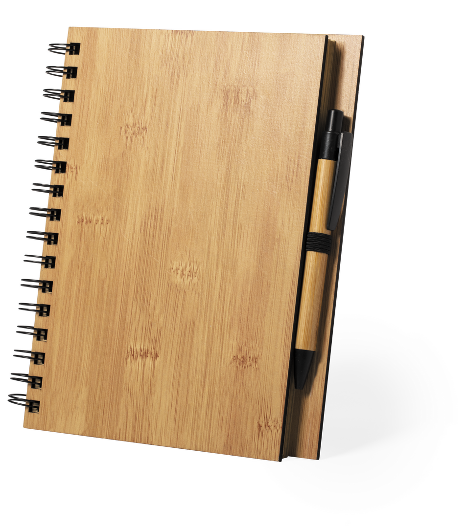 Set de libreta y bolígrafo de línea nature. Libreta de anillas con tapas rígidas en bambú, con soporte para el bolígrafo. De 80 hojas con diseño eco y disposición a una raya. Bolígrafo de mecanismo pulsador, con cuerpo de bambú y tinta negra.