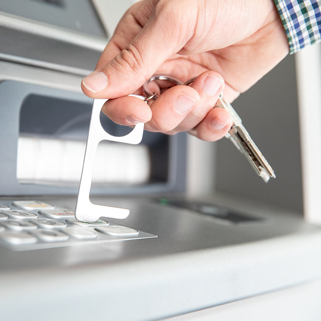 Llavero higiénico anti-contacto, fabricado en resistente acero inox. Especialmente diseñado para evitar tocar con las manos superficies de uso común (picaportes de puertas, interruptores, grifos de uso público, cajeros automáticos…). Con cómodo troquel para el dedo y presentado en bolsita individual. Recomendado para marcaje en láser.