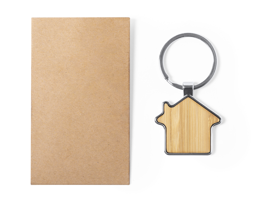 Llavero con forma de casa de línea nature, en combinación de materiales metal de acabado brillante y bambú. Con amplia superficie para marcaje y presentado en bolsa individual con tarjeta kraft.