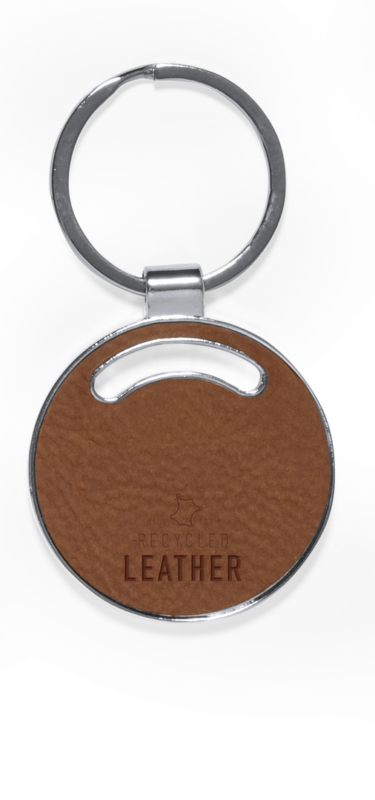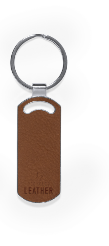 Llavero fabricado en cuero reciclado. En tono marrón, incluye distintivo cuero reciclado en una cara, con lado opuesto liso para impresión y anilla metálica cromada. Disponible en cuatro diseños:A: CasaB: CocheC: CírculoD: RectánguloPresentado en bolsa individual reciclada de cartón kraft.El cuero reciclado rescata las fibras desechadas en los procesos de fabricación del cuero, minimizando el desperdicio de material, contribuyendo a reducir el impacto ambiental y manteniendo a la vez sus propiedades originales.