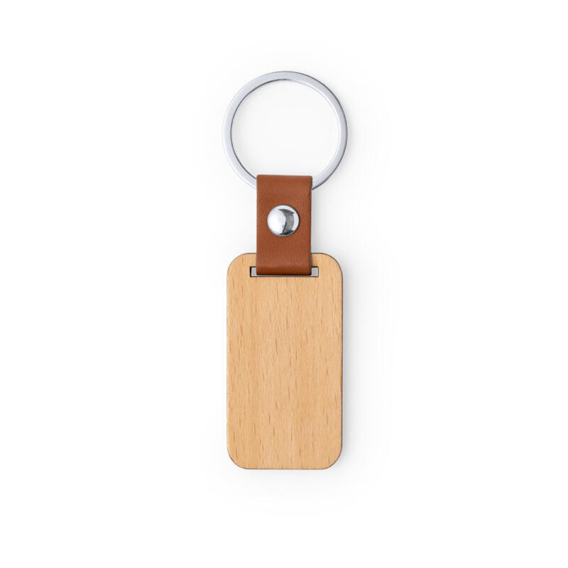 Llavero de línea nature fabricado en madera natural, con original cinta en polipiel marrón y remache cromado. Disponible en diseños rectangular y circular.