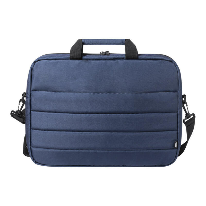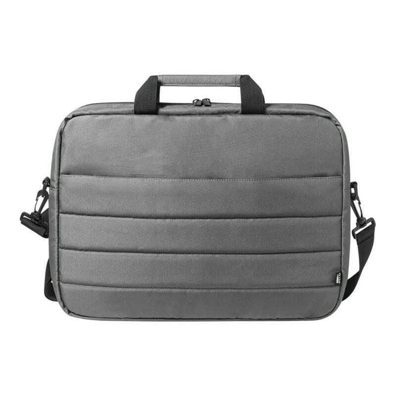 Maletín de línea nature con diseño urbano y acolchado total. Fabricado en resistente RPET 300D elaborado a partir de plástico reciclado, para así fomentar la reutilización de residuos plásticos y contribuir a la sostenibilidad del planeta. Accesorio para ajuste en trolley, con compartimento interior acolchado para ordenador portátil de hasta 15 pulgadas. Bolsillo principal con cierre de cremallera y tirador metálico. Cómodas asas de transporte reforzadas y cinta bandolera ajustable, con refuerzo acolchado para hombro y cierres giratorios de mosquetón. Distintivo RPET en etiqueta.